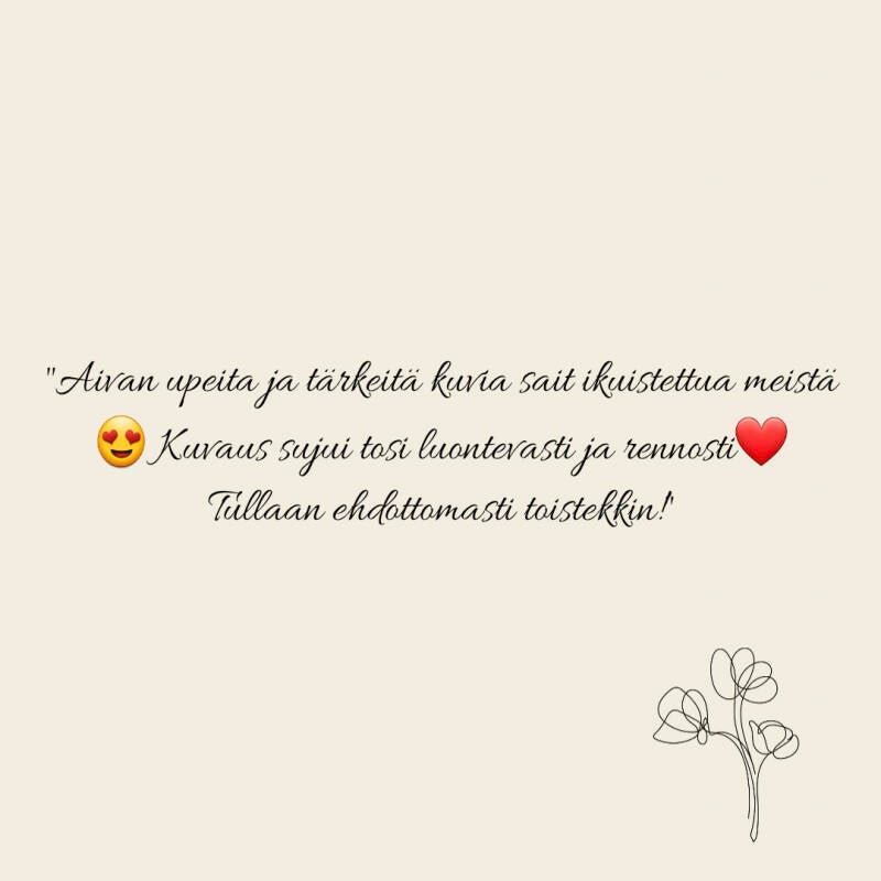 Itseäni kuvailisin rauhalliseksi, lempeäksi ja visuaaliseksi. Työtäni kohtaan olen myös perfektionisti ja yritän jokaisessa kuvauksessa ylittää itseni ja saada aikaan entistäkin ihanempia ja aivan erityisiä kuvia. Näen jokaisen valokuvaushetken uniikkina mahdollisuutena päästä toteuttamaan itseäni kuvien muodossa ja päästä tutustumaan erilaisiin ihmisiin ja perheisiin. Työskentelen aina lapsentahtisesti ja minulle on tärkeämpää saada tallennettua luonnollisiin kuviin lapsen luonnetta ja aitoja tunteita kuin tarkasti aseteltuja poseerauksia. Tervetuloa kuvaukseen siis juuri sellaisina kuin olette!